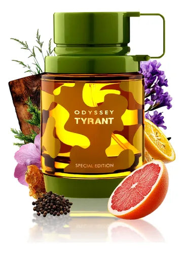 Odyssey Tyrant es una fragancia ambarada amaderada para hombre que fusiona frescura energética y elegancia sofisticada. Su apertura chispeante de pomelo y cítricos se atenúa hacia un corazón aromático de lavanda, geranio, pimienta y elemi, aportando un carácter refinado y distintivo. La base de ambroxan y vetiver sobre un fondo amaderado y cedro le añade una profundidad moderna y una estela cálida y masculina, perfecta para el hombre contemporáneo que busca un aroma de firma versátil, desde el trabajo hasta la noche